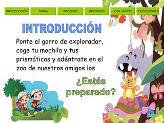 Este documento presenta una actividad educativa sobre animales. Los estudiantes explorarán diferentes secciones de un zoológico virtual, incluyendo animales de granja, selva y domésticos. Participarán en juegos y escucharán sonidos de animales. Su aprendizaje se evaluará observando su capacidad de identificar animales, relacionarlos con su hábitat y sonidos, y conocer sus características. El objetivo es que los estudiantes se diviertan aprendiendo sobre diferentes tipos de animales.