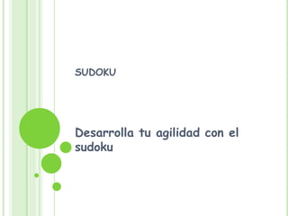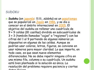 El sudoku es un pasatiempo lógico que consiste en rellenar una cuadrícula de 9x9 celdas con los números del 1 al 9 de tal forma que no se repitan en filas, columnas o regiones de 3x3. Se originó en Japón y su objetivo es desarrollar habilidades lógicas. Se presenta con algunos números dados y el jugador debe completarlo usando deducción. Existen varios niveles de dificultad y sitios web donde jugar sudoku en línea.