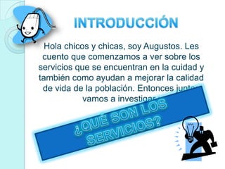 El documento presenta un plan de actividades para investigar los servicios de una ciudad y su importancia para mejorar la calidad de vida. Los estudiantes se dividirán en grupos para definir los conceptos de servicios, clasificarlos y crear una tabla con ejemplos de servicios públicos y privados. Luego, cada grupo realizará una presentación sobre la importancia y cuidado de un servicio en particular, como el agua. El objetivo es que los estudiantes comprendan que los servicios ayudan a las poblaciones y la necesidad de cuidarlos.