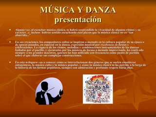 El documento presenta un webquest sobre música y danza dirigido a estudiantes de segundo curso de primaria. El webquest explora la relación entre la música culta y la música popular a través del estudio de varias danzas históricas y sus versiones creadas por compositores clásicos. Los estudiantes se dividen en grupos para investigar danzas medievales, cortesanas, españolas y de salón, comparando sus orígenes, características y versiones cultas.