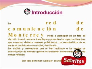 Este documento presenta las instrucciones para un foro de discusión juvenil sobre análisis crítico de mensajes publicitarios. Los participantes se dividirán en equipos para seleccionar un anuncio publicitario, investigar sus características discursivas, y presentar sus hallazgos en una presentación en PowerPoint con el objetivo de reflexionar sobre los valores y efectos de los mensajes publicitarios en la sociedad.