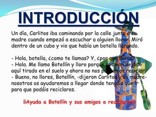 El documento habla sobre la importancia del reciclaje desde la perspectiva de un niño llamado Carlitos. Explica que Carlitos encontró una botella llamada Botellín llorando porque no podía reciclarse. Carlitos y su madre deciden ayudar a Botellín y sus amigos a llegar al contenedor de reciclaje. Como tarea, los estudiantes crearán un mural y contenedores de reciclaje de materiales reciclados y un cartel para concientizar a otros sobre la importancia del reciclaje. Se dividirán en grupos asignados
