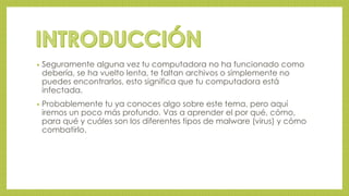 Este documento presenta una tarea escolar sobre virus computacionales. Los estudiantes deben investigar sobre qué son los virus, sus tipos y características, cómo se propagan, síntomas y formas de combartirlos. Luego, deben describir un escenario ficticio donde una computadora se infecta con un virus específico, explicar cómo ocurrió y cómo resolverlo mencionando el tipo de virus, antivirus recomendado y concluir el trabajo. Se proporcionan enlaces a sitios de referencia para la investigación.