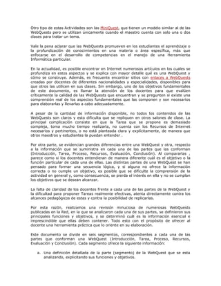 El documento ofrece lineamientos para crear WebQuests efectivas. Explica que una WebQuest es una actividad de aprendizaje que utiliza recursos de Internet seleccionados por el maestro. Se compone de seis partes: introducción, tarea, proceso, recursos, evaluación y conclusión. El documento analiza cada parte y ofrece sugerencias para mejorar la calidad de las WebQuests creadas.