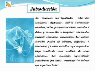 Este documento presenta una serie de ejercicios de ecuaciones que los estudiantes deben resolver individualmente. Explica cómo resolver los ejercicios en un sitio web y que los estudiantes deben enviar sus respuestas por correo electrónico para su revisión y calificación. La actividad tendrá una ponderación del 10% y se evaluará la responsabilidad, puntualidad y claridad en la resolución de los ejercicios. En conclusión, todo problema matemático puede expresarse como una o más ecuaciones aunque no todas tienen solución.