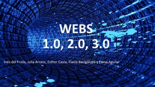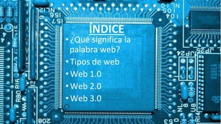 El documento describe la evolución de la web a través de tres generaciones: Web 1.0 (1990-2000) caracterizada por información de solo lectura que se actualizaba poco frecuentemente, Web 2.0 (2000-presente) conocida como la web social que permite interacción bidireccional y compartir información a través de redes sociales, y Web 3.0 (2006-presente) llamada la web semántica que agrega tecnologías como inteligencia artificial para crear aplicaciones sin necesidad de navegador.