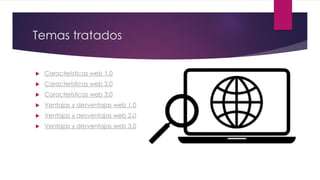 Este documento describe las características de las webs 1.0, 2.0 y 3.0. La web 1.0 se caracteriza por páginas estáticas que no permiten actualizaciones ni retroalimentación de los usuarios. La web 2.0 se centra en el usuario y permite servicios en lugar de software empaquetado. La web 3.0 utiliza inteligencia artificial para hacer que la información sea más fácil de encontrar y compartir de forma distribuida.