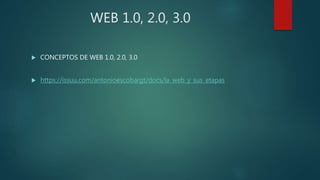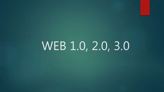 La Web 1.0 era estática y de solo lectura, la Web 2.0 permitió la interacción y contenido generado por los usuarios a través de las redes sociales, y la Web 3.0 pretende ser semántica e inteligente mediante el procesamiento automático de datos para entender mejor el significado y las intenciones de los usuarios.