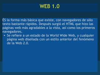 La Web 1.0 fue la versión más básica de la World Wide Web con navegadores de texto simples. La Web 2.0 permitió compartir información a través de aplicaciones web. La Web 3.0 describe la evolución continua de la red hacia una mayor interacción a través de diferentes caminos que transforman la experiencia en la web.