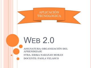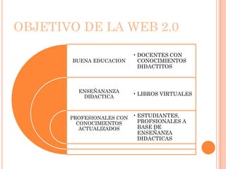 El documento habla sobre la Web 2.0 y sus aplicaciones didácticas para la enseñanza y el aprendizaje. Explica que la Web 2.0 permite la transmisión bidireccional de información escrita y audiovisual a través de recursos multimedia e incluye aplicaciones como blogs, redes sociales y entornos de compartir recursos. El objetivo es que docentes y estudiantes tengan acceso a conocimientos actualizados de forma didáctica a través de libros virtuales y nuevas enseñanzas basadas en la tecnología.