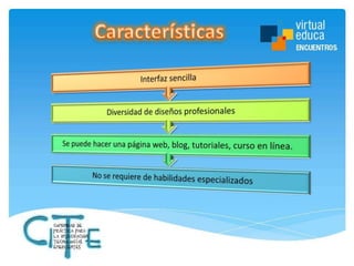 Weebly es una herramienta en línea para crear páginas web lanzada en 2007. Usa "widgets" simples para construir páginas y ahora tiene 12 millones de usuarios. Permite a estudiantes y profesores interactuar y compartir trabajos desde cualquier dispositivo. Es efectiva para proyectos de aprendizaje basados en la colaboración entre estudiantes.