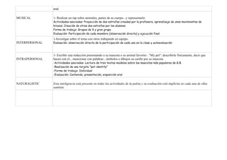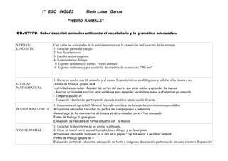 Este documento presenta una paleta de actividades para una lección de inglés de 1o de ESO sobre animales extraños. La lección incluye escuchar y leer descripciones de animales, escribir textos creativos, representar diálogos y exponer oralmente y por escrito sobre mascotas. Las actividades involucran trabajar en grupos para describir animales, crear un mural y componer un rap sobre animales.