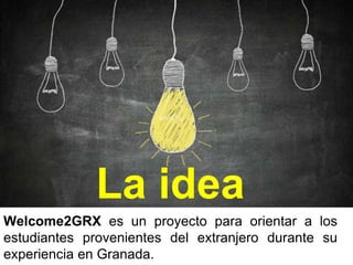 Este documento describe un proyecto llamado Welcome2GRX que tiene como objetivo orientar a estudiantes extranjeros durante su estancia en Granada a través de Twitter. El proyecto busca contactar al 30% de estudiantes extranjeros, especialmente de Erasmus, y proveer información sobre transporte, actividades, alojamiento y otros temas. Se medirá el impacto utilizando herramientas de análisis de Twitter y se diferenciará de otras comunidades en Facebook al enfocarse también en personas con estancias más prolongadas en Granada.