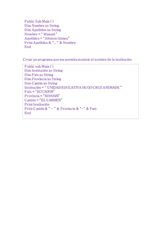 Este documento contiene 15 programas en Visual Basic desarrollados por Wellington Vélez para el curso de tercer año de bachillerato especialidad en sistemas. Los programas incluyen cadenas de texto, cálculos matemáticos, conversiones de unidades, resolución de ecuaciones, select case, sentencias if y for, y aplicaciones gráficas como una calculadora básica y una aplicación para determinar la edad de una persona.