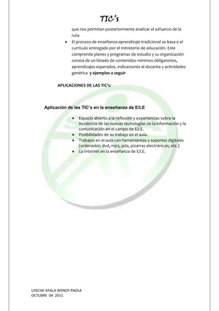 Las Tecnologías de la Información y la Comunicación (TIC) se refieren al uso de medios informáticos para almacenar, procesar y difundir información educativa. Algunas características clave de las TIC incluyen que son innovadoras, mejoran el acceso a la educación, y están relacionadas con el uso de Internet y la computación. Las TIC se pueden aplicar en el aula mediante el uso de monitores de frecuencia cardíaca, herramientas digitales como ordenadores y pizarras electrónicas, y sit