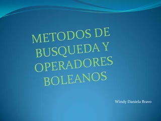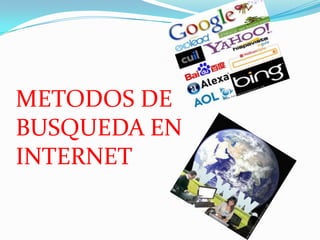 Este documento describe diferentes métodos y herramientas para realizar búsquedas en Internet, incluyendo motores de búsqueda, directorios temáticos, metabuscadores y operadores booleanos para realizar búsquedas más específicas. Explica que los motores de búsqueda indexan páginas web y las organizan por palabras clave, mientras que los directorios las organizan por temas jerarquizados. También cubre el uso de operadores booleanos como AND, OR y NOT para combinar términos de búsqueda.
