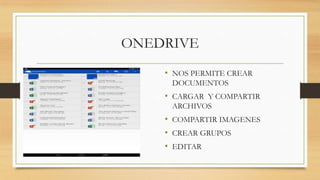 El documento compara tres herramientas de almacenamiento en la nube: OneDrive permite crear documentos y compartir archivos y carpetas, Dropbox sincroniza archivos entre dispositivos y mantiene copias de seguridad de versiones anteriores, y Drive permite acceder a archivos guardados desde cualquier lugar con conexión a Internet y almacenar documentos de forma privada.