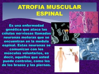 Este documento resume la enfermedad de la atrofia muscular espinal (AME), una enfermedad genética hereditaria que ataca las neuronas motoras de la médula espinal. Existen tres tipos principales de AME que varían en gravedad y edad de aparición, siendo el tipo I el más grave. La AME se transmite como un carácter autosómico recesivo y actualmente no tiene cura, aunque existen tratamientos de apoyo como fisioterapia, terapia respiratoria y cirugía ortopédica.