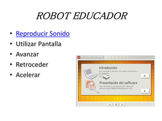 El documento describe las capacidades de un robot educador propuesto, incluyendo reproducir sonido, utilizar una pantalla, avanzar, retroceder y acelerar. Para cada capacidad, se menciona la representación y programación requerida.