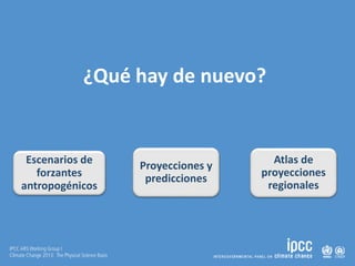 El documento describe los escenarios de forzantes antropogénicos y proyecciones climáticas regionales según el Quinto Informe de Evaluación del IPCC. Explica los cuatro escenarios representativos de concentración de partículas (RCP) y sus asociados forzantes radiativos. Luego, presenta mapas de proyecciones de cambios de temperatura y precipitación en Argentina para el período 2016-2100 según el escenario RCP4.5. Finalmente, discute conceptos como señal/ruido y variabilidad interna para evaluar