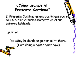 El documento explica el uso del presente continuo en inglés. Se forma con el verbo to be (is, am, are) más el verbo principal con ending -ing. El verbo to be cambia según el sujeto: I acompaña a am, pronombres como he/she/it a is, y you/we/they a are. Se proveen ejemplos con imágenes para practicar la formación y uso del presente continuo.