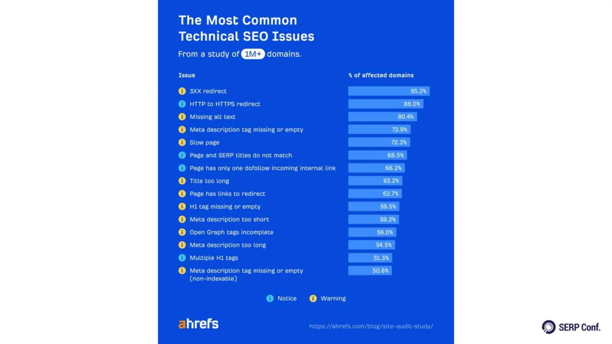 Patrick Stox from Ahrefs shared insights from auditing over 1,000,000 websites, highlighting critical technical SEO issues such as broken links, redirects, and indexability concerns. Key findings include high percentages of 'noindex' tags, missing meta descriptions, and mixed content issues affecting site performance. The presentation underscores the significance of addressing these issues for improved SEO outcomes and user experience.