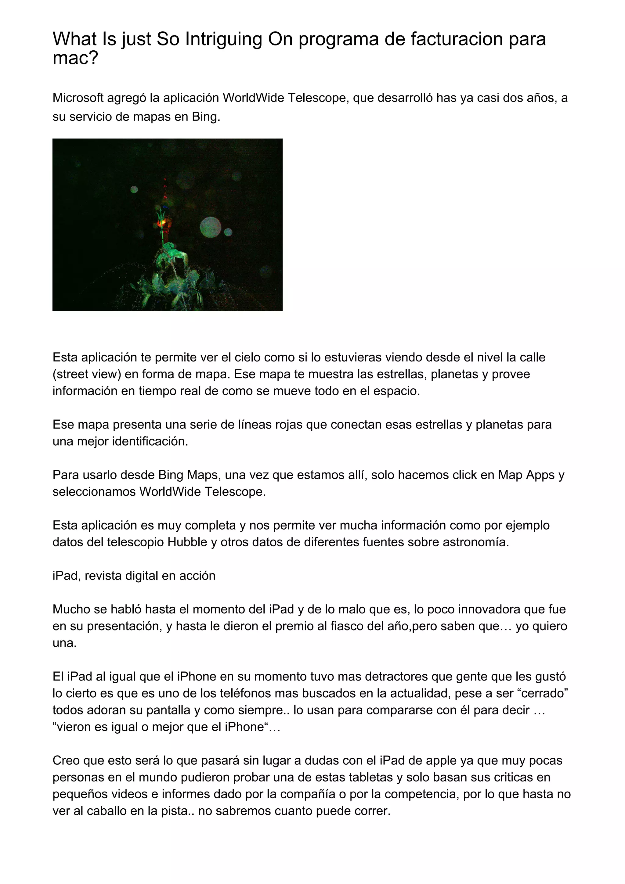 El documento describe tres aplicaciones diferentes: WorldWide Telescope, que permite ver el cielo y los objetos astronómicos desde la perspectiva de la Tierra; el iPad y su potencial como dispositivo para revistas digitales interactivas; y Fotobabble, un servicio que permite agregar audio a fotografías.