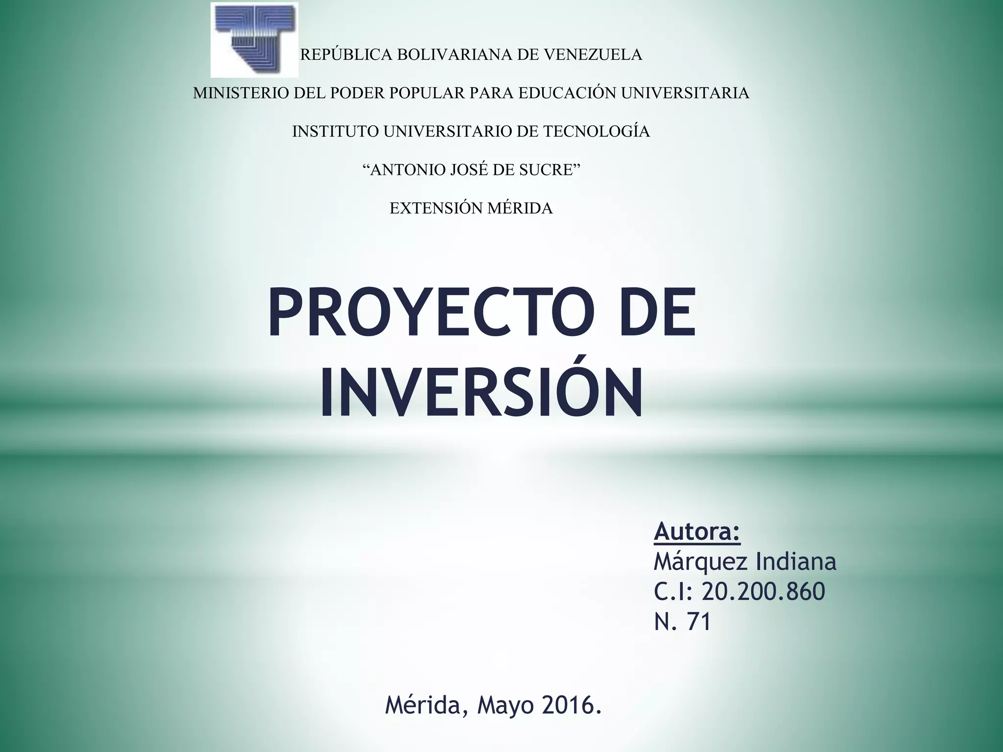 Este documento propone un proyecto de inversión para la Extensión Mérida del Instituto Universitario de Tecnología "Antonio José de Sucre". El proyecto fue escrito por Márquez Indiana en mayo de 2016 para el Ministerio del Poder Popular para Educación Universitaria de la República Bolivariana de Venezuela.