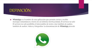 WhatsApp es una aplicación de mensajería instantánea gratuita que permite el intercambio de textos, audios, videos y fotografías entre usuarios. Fue fundada en 2009 y adquirida por Facebook en 2014 por 19 mil millones de dólares. Es una de las aplicaciones más populares debido a su bajo costo y facilidad de uso, con más de 1000 millones de usuarios activos a nivel mundial.