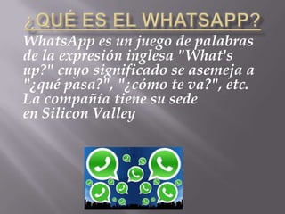 Este documento describe las características y funcionalidades de la aplicación WhatsApp. WhatsApp es una aplicación de mensajería gratuita disponible para teléfonos móviles que permite el intercambio de mensajes de texto, imágenes, videos y audio entre usuarios. La aplicación se sincroniza con los contactos del teléfono y permite chatear sin costo adicional más allá de los datos móviles.
