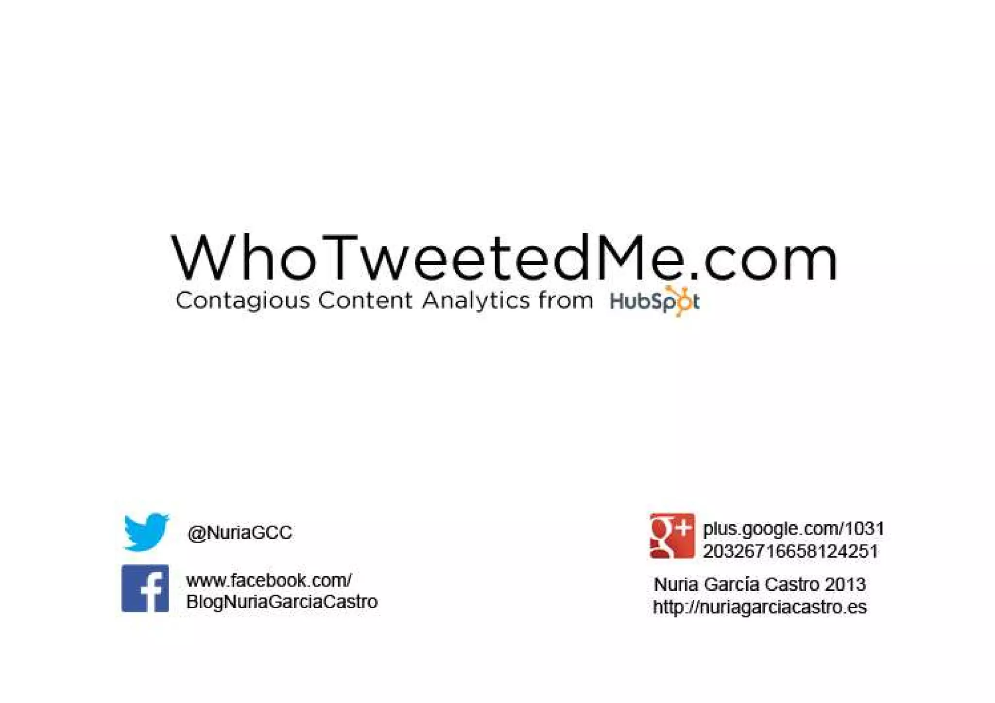 Who TweetedMe es una plataforma que analiza la actividad en Twitter de una URL introducida por el usuario. El informe muestra un resumen de la actividad en Twitter de la URL, incluyendo retweets, alcance y exposición. También muestra qué personas han compartido la URL, cuántos seguidores tienen y permite agradecerles directamente.