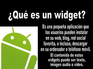 Un widget es una pequeña aplicación que los usuarios pueden instalar en sus sitios web, blogs o dispositivos móviles para agregar contenido como texto, imágenes, audio o video de una manera personalizada. Los sitios web www.widgetbox.com y www.widgiland.com ofrecen herramientas para crear y encontrar widgets.