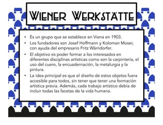 El Wiener Werkstätte fue un taller de artes y oficios fundado en Viena en 1903 con el objetivo de enseñar diferentes disciplinas artísticas y diseñar objetos accesibles para todos. Produjeron obras de alta calidad en vidrio, muebles, metal, joyería, cerámica, textiles y artes gráficas. El taller cerró en 1932 debido a los cambios económicos y políticos derivados de la Primera Guerra Mundial.