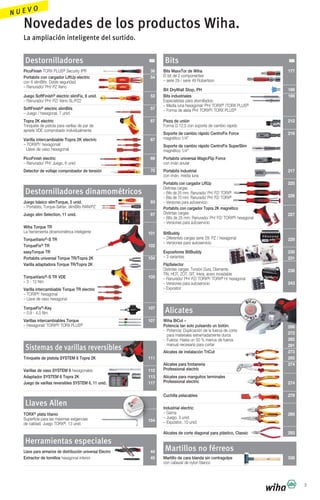 El documento presenta las novedades de productos de Wiha para 2014-2016, incluyendo nuevas herramientas como Wiha BiCut y SoftFinish electric slimBits. Se proporciona información sobre diferentes categorías de productos como destornilladores, llaves Allen, bits, alicates y martillos no férreos, así como sistemas de varillas reversibles y portabits. El documento también incluye un índice de las gamas de productos de Wiha para ayudar a los clientes a encontrar las herramientas adecuadas.