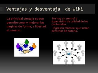 Este documento describe las características principales de un wiki, incluyendo que permite a múltiples voluntarios editar colaborativamente páginas web a través de un navegador, que tiene ventajas como permitir crear y mejorar contenido de forma abierta pero también desventajas como falta de control de calidad y posible inclusión de material con derechos de autor, y explica cómo crear y configurar un wiki en Wikispaces.