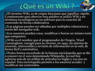 Un wiki es un software para la creación colaborativa de contenido en la web. Los usuarios pueden editar páginas a través de un navegador, creando, modificando o borrando texto de forma conjunta. Wikipedia es un ejemplo famoso de wiki, donde los usuarios pueden acceder y modificar sus contenidos de forma libre.
