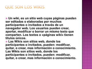 Un wiki es un sitio web cuyas páginas pueden ser editadas por múltiples participantes a través de un navegador. Los usuarios pueden crear, modificar o eliminar contenido de forma colaborativa. Los wikis permiten la creación y mejora instantánea de páginas de forma sencilla, fomentando la participación de más usuarios. Se usan comúnmente para compartir y expandir conocimiento de forma colaborativa.