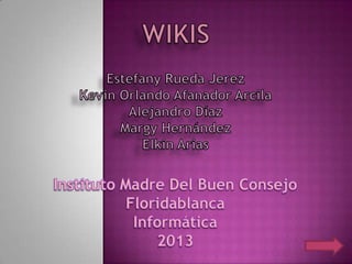 Este documento describe lo que es una wiki, cómo se puede crear una, sus características distintivas en comparación con otras aplicaciones web 2.0, ejemplos de wikis como Usemod wiki y Dokuwiki, las herramientas que contiene Wikispaces como notificaciones y estadísticas, y las diferencias entre una wiki y un blog como la edición colaborativa y la capacidad de restaurar páginas anteriores.