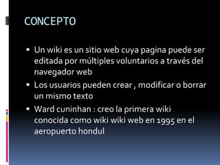 Un wiki es un sitio web cuyas páginas pueden ser editadas por múltiples voluntarios a través de un navegador web, permitiendo que los usuarios creen, modifiquen o eliminen texto. Ward Cunningham creó la primera wiki conocida, llamada wiki wiki web, en 1995 en el aeropuerto de Honolulu. Las wikis brindan la posibilidad de que varios usuarios editen contenido a través de un navegador web con restricciones mínimas.