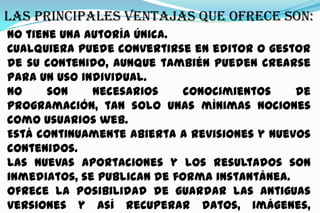 Este documento explica qué es un wiki, una herramienta web que permite organizar contenidos de forma colaborativa. Los wikis permiten que cualquier persona edite o añada contenido sin necesidad de conocimientos de programación. Se utilizan principalmente con fines educativos, permitiendo a los estudiantes trabajar en grupo y crear su propio conocimiento a través de la lectura, investigación, discusión y escritura colaborativa.