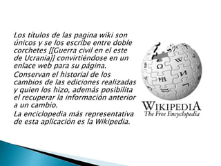 Este documento describe las características principales de los wikis. Un wiki es un sitio web cuyas páginas pueden ser editadas por cualquier usuario y cuyo contenido es creado de forma colaborativa. Los wikis permiten editar páginas de manera rápida y sencilla desde el navegador y conservan un historial de cambios de las ediciones. El wiki más conocido es Wikipedia, la enciclopedia libre en línea.