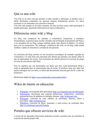 Una wiki es un sitio web colaborativo que permite a los usuarios crear y editar contenido fácilmente sin necesidad de habilidades técnicas. A diferencia de los blogs, donde solo los propietarios pueden hacer publicaciones, en las wikis todos los participantes pueden contribuir y editar. Este documento también aborda cómo utilizar Wikipedia como un recurso educativo, ofreciendo ejemplos de edición y creación de nuevas páginas.