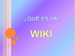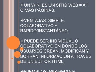 Un wiki es un sitio web colaborativo que permite a los usuarios crear y editar fácilmente su contenido. Un wiki típicamente tiene una estructura de páginas interconectadas y permite agregar texto, imágenes, videos y otros archivos. Antes de crear un wiki, se debe considerar su objetivo, contenido, audiencia y nivel de acceso. La estructura básica de un wiki incluye un objetivo central accesible desde la página principal y una doble estructura de páginas internas con contenido editable.