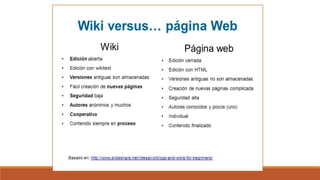 Este documento describe qué es un wiki, cómo funciona y algunos ejemplos de su uso. Un wiki es una herramienta que permite crear páginas web de forma colaborativa mediante ediciones sencillas. Cualquier usuario puede editar el contenido de una página haciendo clic en un botón. Los wikis se usan para compartir información entre grupos de trabajo de manera eficiente. Algunos ejemplos populares son Wikipedia y los wikis escolares para tareas grupales.
