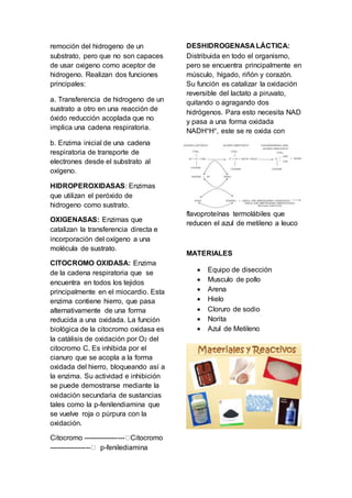 Este documento describe un experimento para separar y demostrar la acción de la enzima láctica y la coenzima obtenidas de músculo de pollo. Se explica que la enzima fue extraída triturando el músculo, mientras que la coenzima se obtuvo calentando y triturando el músculo. Finalmente, se muestran los resultados del experimento donde se demuestra la acción de la enzima láctica al cambiar el color del azul de metileno.