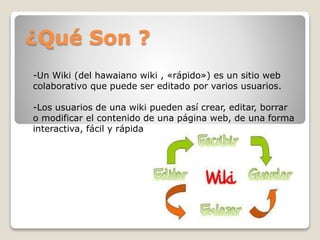 Este documento describe qué son los wikis, su historia, características, ventajas y desventajas. Un wiki es un sitio web colaborativo que permite a múltiples usuarios crear y editar contenido de forma rápida y sencilla. El primer wiki fue creado por Ward Cunningham y Wikipedia es el wiki más grande. Los wikis permiten la colaboración pero también tienen el riesgo de vandalismo y contenido no fiable.