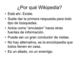 Este documento proporciona una introducción a editar en Wikipedia para instituciones culturales. Explica por qué Wikipedia es importante, cómo aprender la cultura y prácticas de Wikipedia antes de participar, y formas en que las instituciones culturales pueden involucrarse, como creando artículos, liberando imágenes, organizando eventos de edición colaborativa, y designando wikipedistas residentes para mejorar los artículos relacionados con la institución. También cubre temas como la Fundación Wikimedia, la política de conflicto de intereses, y cómo enl