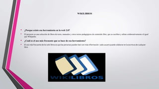 Este documento describe Wikilibros, una colección de libros de texto y otros materiales educativos que pueden ser editados colaborativamente en línea. Explica que Wikilibros fue creado por Jimmy Wales y la Fundación Wikimedia para proporcionar contenido educativo gratuito que cualquier persona puede leer y editar. También destaca las ventajas del aprendizaje colaborativo promovido por Wikilibros, como la construcción de conocimiento colectivo, el desarrollo de habilidades sociales y la satisfacción del trabajo en equipo.