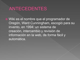 Un Wiki es un software para crear contenido de forma colaborativa. Fue inventado en 1994 por Ward Cunningham como un sistema para crear e intercambiar información en la web de manera fácil y automática. Los Wikis permiten que varios usuarios creen páginas web sobre un mismo tema aportando conocimiento para hacerlas más completas, creando así una comunidad que comparte contenido.