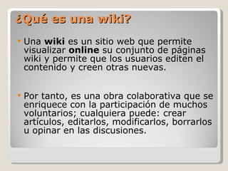 Una wiki es un sitio web colaborativo donde los usuarios pueden crear y editar contenido de forma conjunta. Esto permite realizar tareas colaborativas, compartir conocimiento de forma bidireccional y mejorar la comunicación entre alumnos y profesores. Las wikis se pueden utilizar en el aula para escribir apuntes, enlazar recursos, recopilar información sobre un tema de forma colaborativa y realizar diferentes actividades de escritura grupal.